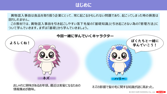 異物混入事故は食品を取り扱う企業にとって、常に起こるかもしれない問題であり、起こってしまった時の損害は図りしれません。この教材では、異物混入事故を引き起こしやすい落下毛髪の『基礎知識』と、引き起こさない為の『管理方法』について学んでいきます。
