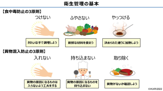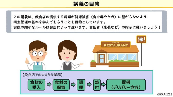 飲食店で提供する料理が健康被害(食中毒やケガ)に繋がらないよう、衛生管理の基本を学んでもらうことを目的としています。各飲食店で設けられている衛生管理ルールの理解を深め、より安心・安全な食の提供を実現しましょう。
